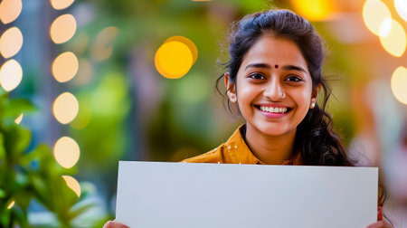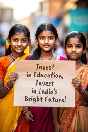 Indian girls hold a sign Invest in Education, Invest in Indias Bright Future. Generative AI.