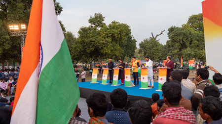 DELHI, INDIA - MARCH 13, 2019: candidates prepare for an election debate at india gate in new delhi