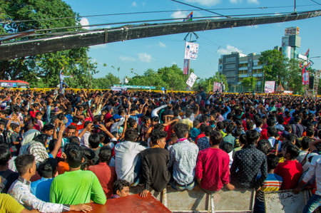 AMRAVATI, MAHARASHTRA, INDIA - 8 SEPTEMBER 2018: Crowd of young People enjoying and dancing in the Govinda at Dahi Handi festival to celebrate God Krishna's Birth.