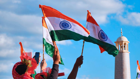 Vibrant Street Scene with Colorful Flower Garlands Celebrating Republic Day in India. Concept of Cultural Festivity, National Pride, Traditional Decorations, and Community Spirit. Copy space.