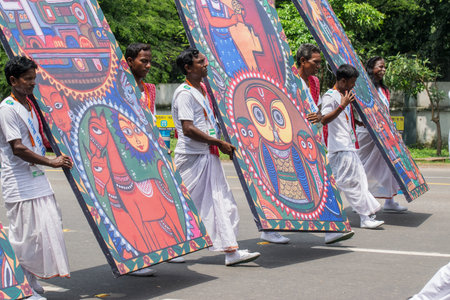 KOLKATA, WEST BENGAL / INDIA - AUGUST 15TH, 2016 : Folk dancers marching past , in India's Independence day rally, with artistic handicraft hoarding in their hands. The day in celebrtated all over India with joy.