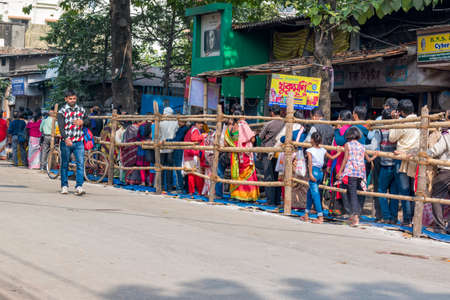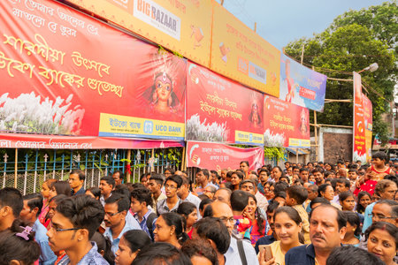 KOLKATA , INDIA - SEPTEMBER 29, 2017 : Devotees walking to pray to Goddess Durga idol inside decorated Durga Puja pandal at college square. Durga Puja is biggest religious festival of Hinduism.