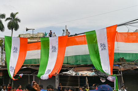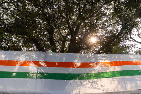 Road side of Red road has been coevered with white cloth with orange and green striped colours on the occasion of Indenpendence day of India. Sun shining through trees. Kolkata, West Bengal, India.