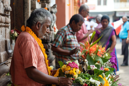 Worshippers engage in a prayer ritual with a vibrant display of floral tributes at a religious gathering