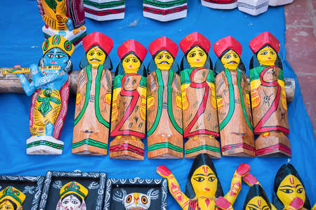 Indian Traditional Handmade wooden toys are displayed in a street shop for sale. Indian handicraft and art