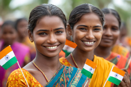 Young Indian woman in national dress against background of flag of India, holiday on street of an Indian city