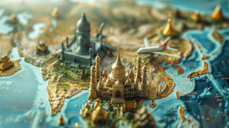 Miniature airplane flying over asia with famous landmarks on map