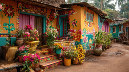 A picturesque scene featuring vibrant, intricately decorated village houses adorned with colorful flowers and lush greenery, capturing a serene tropical atmosphere.