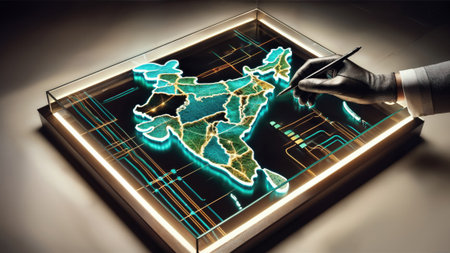 Futuristic India map. A gloved hand uses a stylus on a glowing, futuristic 3D map of India, symbolizing technology, business, and innovation.