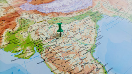 view of India, officially the Republic of India, is a country in South Asia on a geographical map of ASIA, marked with green push pin