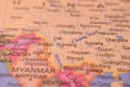 Shallow depth of field focus on geographical map location of Mount Kamet in India Asia continent on atlas