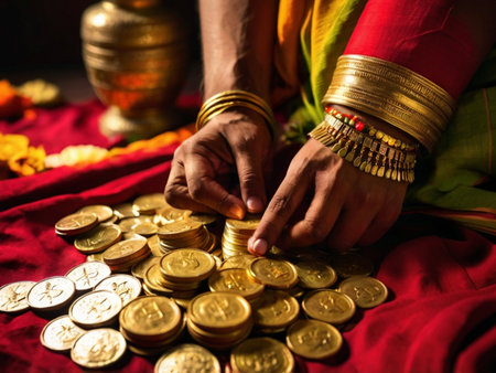 Indian man counting money with golden coins. Selective focus on hands.