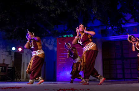 PUSHKAR, RAJASTHAN / INDIA NOVEMBER 2019 : Young girls performing Indian classical Odissi dance in Pushkar Camel Fair