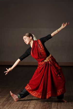 Young Indian woman in traditional dress dancing in the old city.