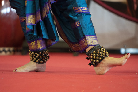 indian classical dance form in feet with musical anklet with selective focus and blur