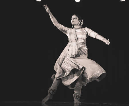 Asian female performing traditional indian dance under stage spotlight