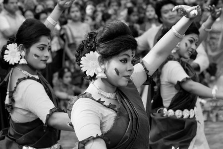 Kolkata, India - 21st March, 2019 : Girl dancers dressed in sari, traditional Indian dress with Palash flowers, Butea monosperma, make up, dancing at Holi festival. Black and white.