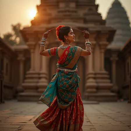 A beautiful indian woman dancing in a traditional outfit, AI