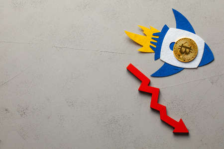 Bitcoin rocket with a cryptocurrency coin falls down. The fall of the cryptocurrency market and the rate of Bitcoin.