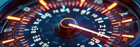 Close-up of glowing speedometer dial with illuminated orange and blue details. That the image is generated using AI.