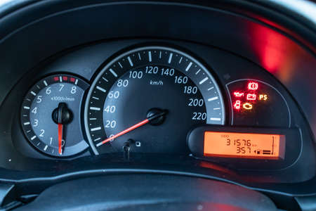 Close up shot of a speedometer in a car. Car dashboard. Dashboard details with indication lamps.Car instrument panel. Dashboard with speedometer, tachometer, odometer. Car detailing. Modern interior