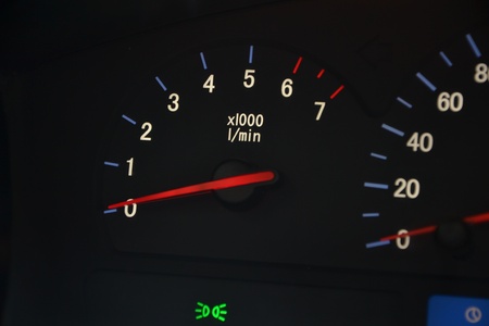 Close up shot of a car's tachometer.