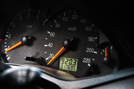 Speedometer kilometer per hour on dashboard of the automobile