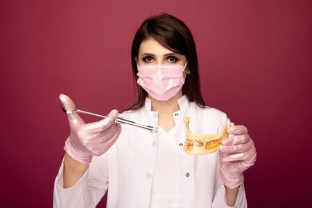 A dental doctor wearing blue gloves and a mask holds a dental model of the upper and lower jaws and a dental mirror.
