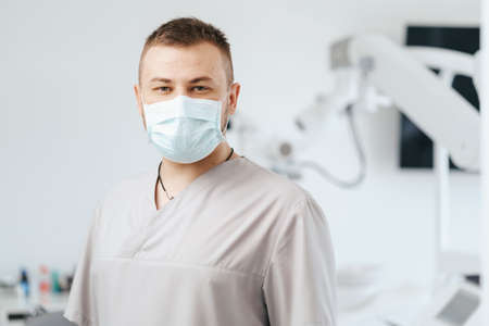 Serious male dentist wearing surgical mask and gloves, preparing for a dental procedure in a clean, sterile environment