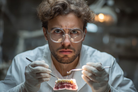 Close up of dentist in blue uniform and transparent glasses holding dental instruments and checking up teeth health condition.