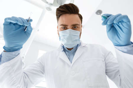 Male dentist in blue sterile gloves holding stainless steel dental explorer and mirror. Male dentist in medical face mask using dental diagnostic microscope. Concept of dentistry and dental care.