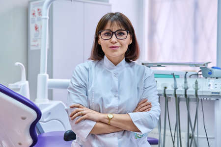 Professional dental doctor is working in office. The dentist holds a dental lamp in order to examine the patient. The concept of an appointment with a doctor in a clinic.