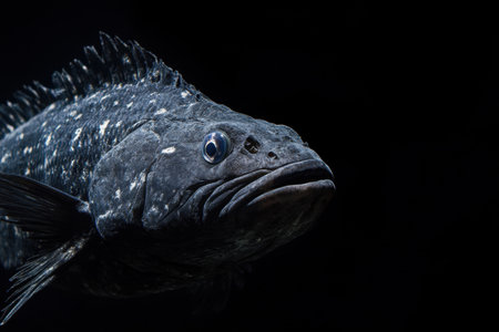 The image showcases a close up view of a black fish gracefully moving through dark water. Its intricate textures and patterns are highlighted against the black background allowing viewers to appreciate the fishs unique features such as its expressive face and fins