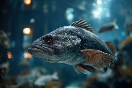 A large fish with its mouth open is swimming in the dark blue water. The fish appears to be in a state of hunger, as it is looking for food. Concept of mystery and intrigue