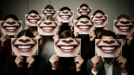 A group of people holds printed smiling faces in front of their own, creating a visual effect. The image features neutral tones with a focus on facial expressions and composition. This photograph is likely suited for a variety of conceptual projects and commercial applications.