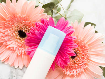 Face moisturizer over pink flowers on marble. Beauty skin care products concept, closeup