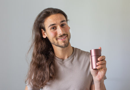 Young man is applying antiperspirant to his armpit.