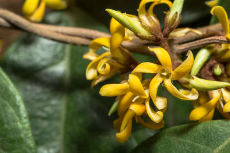 Close up of yellow osmanthus and green leaves