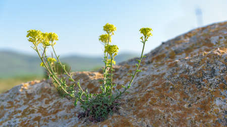 Alyssum montanum flower growing in mountains, close up