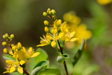 Detail of Rue (Ruta montana) plant blooming in mountain.