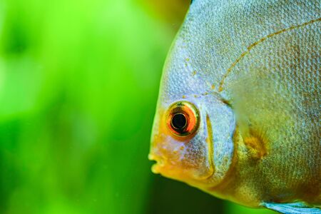 Floating Symphysodon discus in tank. Freshwater aquarium fish with shiny scales.