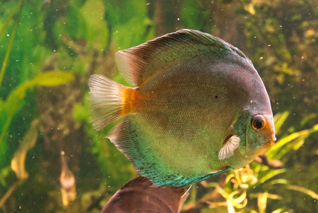 Portrait of a blue tropical Symphysodon discus fish in a fishtank.