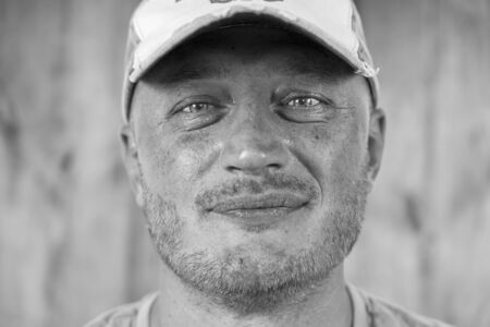 Closeup shoot of caucasian man in a cap. People and lifestyle concept. Portrait of middle aged man indoors, black and white