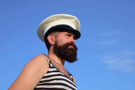 Funny captain sailor wearing hat. Seaman fun. Portrait of serious captain. Bearded sailor, seaman.