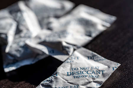 packets of desiccant scattered on a dark surface