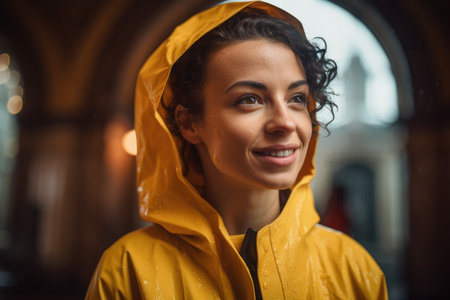 A woman in a yellow raincoat is standing in front of a building