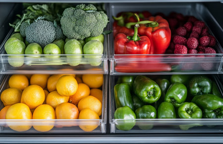 Fresh vegetables and fruits in an open modern refrigerator for healthy lifestyle concept