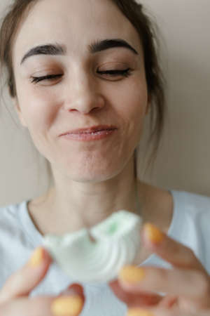 Young woman eating marshmallow. Pretty caucasian woman smiling. Sincere emotions. facial expressions
