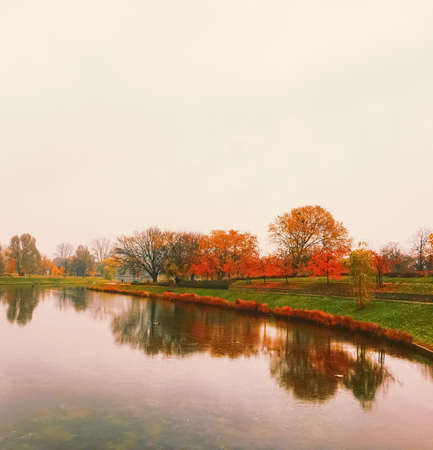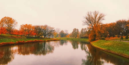 Sunset on the river in park, beautiful autumn nature