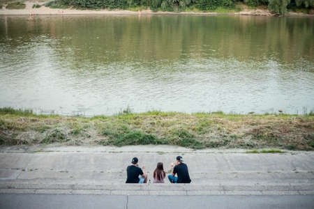 SZEGED, HUNGARY - JULY 21, 2017: Selective blur on a Group of young people, boys and girls, friends, relaxing and sitting by the riverbank of Tisza river in Szeged, drinking alcohol at dusk.